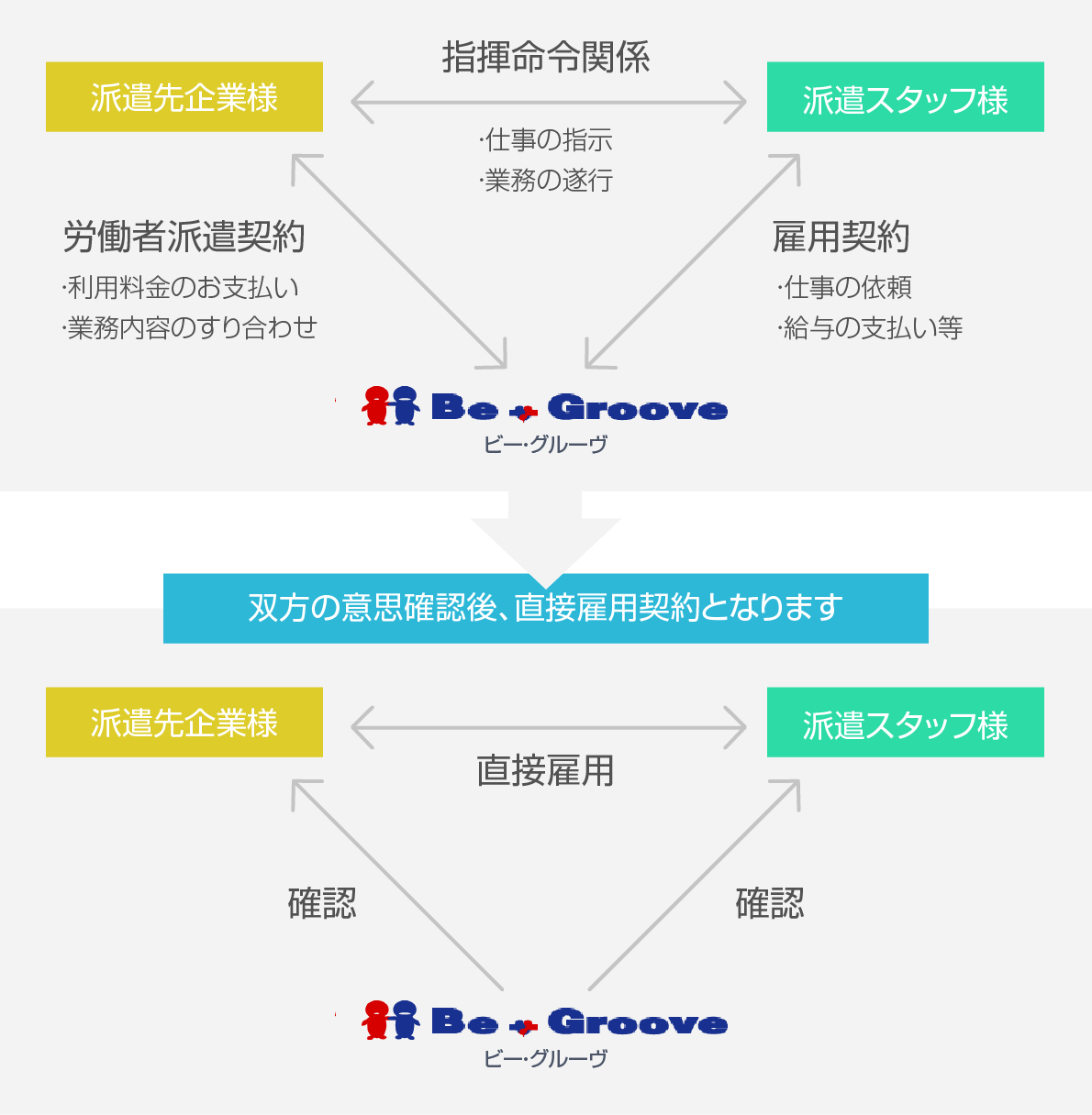 派遣先企業様は派遣期間中に候補者の能力や適性をスタッフは職場環境や業務の内容を見極めることが出来、雇用後のミスマッチを防ぐという点で派遣先企業様・派遣スタッフともにメリットの大きい雇用形態です。