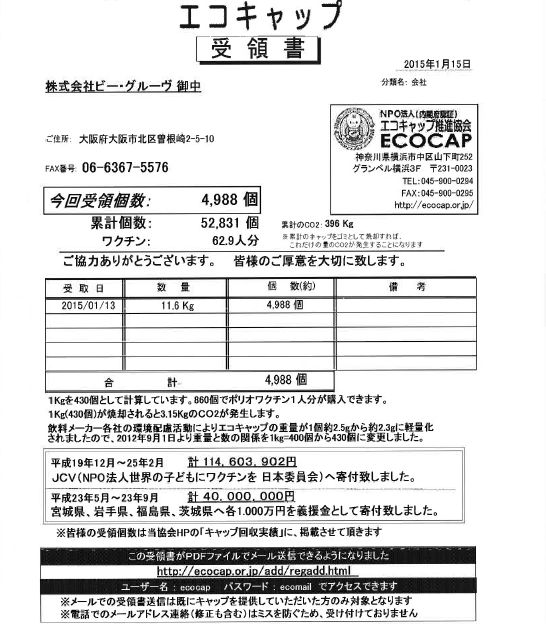 昨年(2014年)の10月~12月の間に当社社員と派遣スタッフの皆様のご協力により、下記の数のキャップが集まりました♪